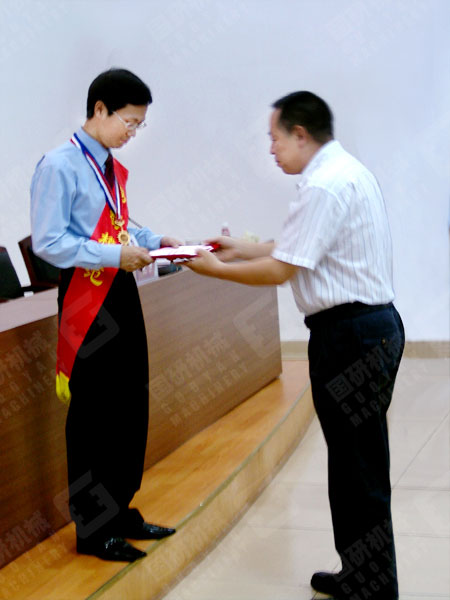 大會在莊嚴(yán)的國歌聲中拉開了序幕。胸戴大紅花,身披綬帶的廣州市勞動模范、國研機(jī)械市場部經(jīng)理劉啟剛同志受到了公司領(lǐng)導(dǎo)和全體員工的熱烈歡迎。董事長兼總經(jīng)理王聲位親自為劉啟剛同志佩戴廣州市委、市政府頒發(fā)的廣州市勞動模范獎狀并頒發(fā)獎金。