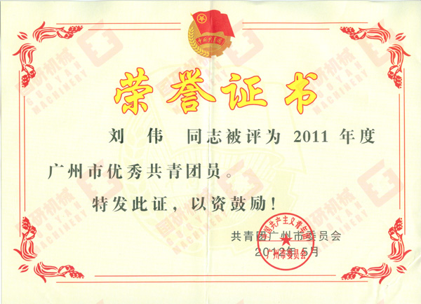 2012年6月,國研機(jī)械公司劉偉同志被共青團(tuán)廣州市委員會(huì)評(píng)為“2011年度廣州市優(yōu)秀共青團(tuán)員”。