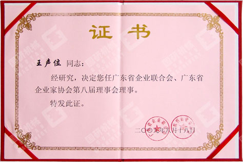 公司董事長兼總經(jīng)理被授予廣東省企業(yè)聯(lián)合會、廣東省企業(yè)家協(xié)會第八屆理事會理事證書