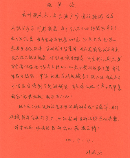 5月13日下午,一封署名為鄧名兵的感謝信送至公司領(lǐng)導(dǎo)手中,信中詳細(xì)描述了公司倉管員歐小鳳拾金不昧的感人事跡,請求公司對歐小鳳進(jìn)行表揚(yáng),并感謝公司培養(yǎng)了歐小鳳這樣的好員工。